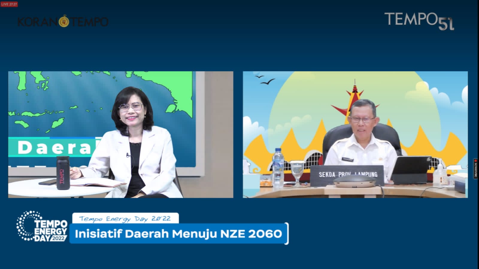 Kinni.id, Bandar Lampung – Sekretaris Daerah Provinsi Lampung, Fahrizal Darminto menjadi narasumber pada acara Tempo Energy Day 2022 dengan Tema “Inisiatif Daerah Menuju NZE 2060,” melalui Virtual Meeting, bertempat di Ruang Rapat Command Center Lt.II Diskominfotik, Rabu (19/10/2022).