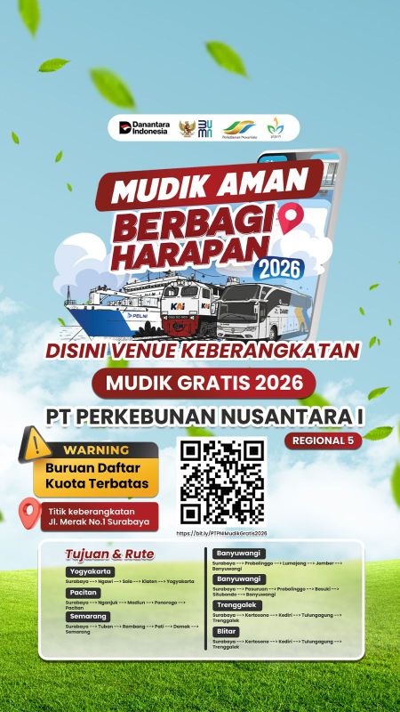 KINNI.ID, SURABAYA – PTPN I menggelar “Mudik Aman Berbagi Harapan 2026”. Program pulang kampung gratis yang difasilitasi BUMN di bawah Danantara ini dapat diakses tautan https://bit.ly/PTPNMudikGratis2026.
