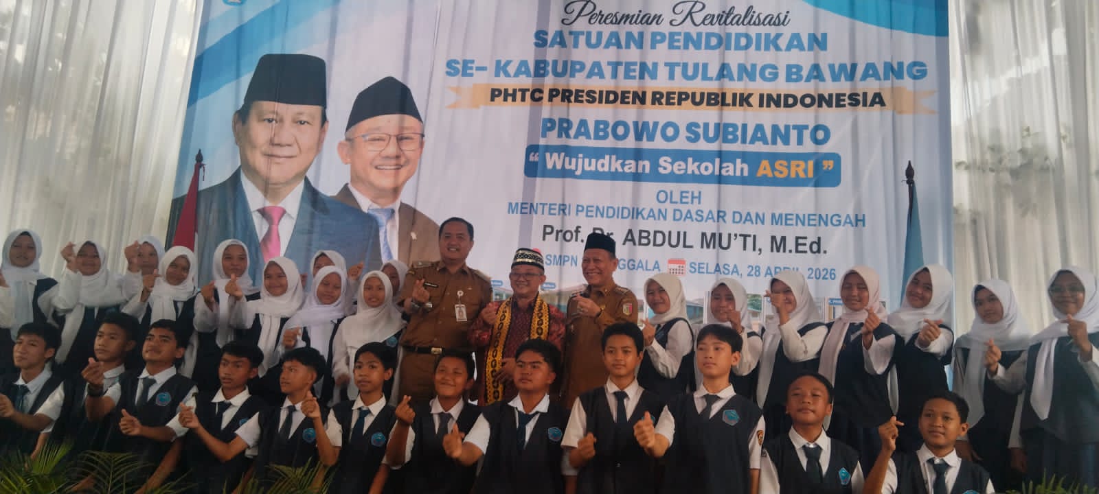 KINNI.ID, TULANG BAWANG – Peresmian revitalisasi satuan pendidikan se-Kabupaten Tulangbawang melalui Program Hasil Terbaik Cepat (PHTC) Presiden Republik Indonesia Prabowo Subianto berlangsung khidmat dengan mengusung tema “Wujudkan Sekolah ASRI”. Kegiatan ini dipusatkan di halaman SMP Negeri 02 Menggala, Kecamatan Menggala, Kabupaten Tulangbawang, Selasa (28/4).